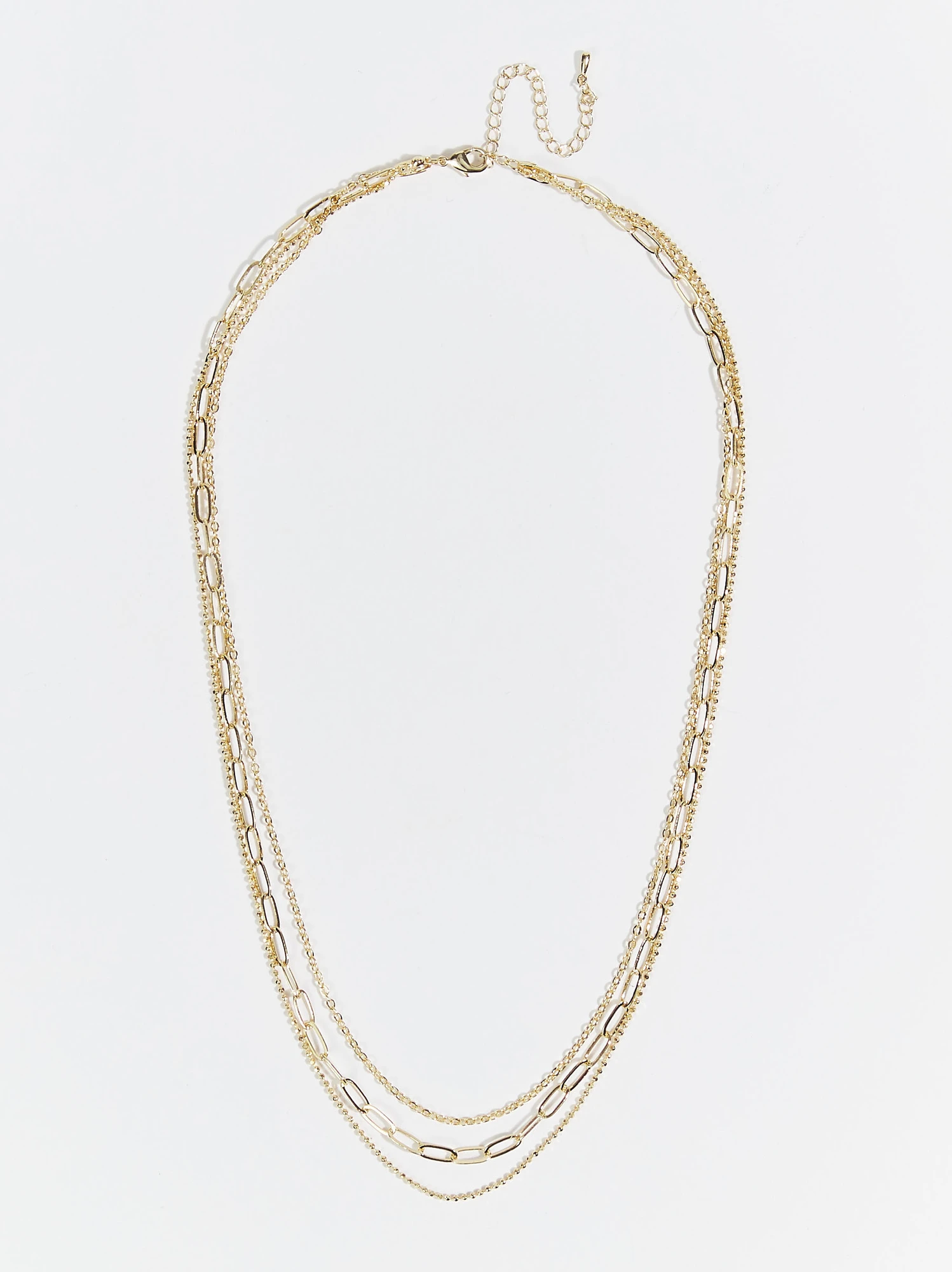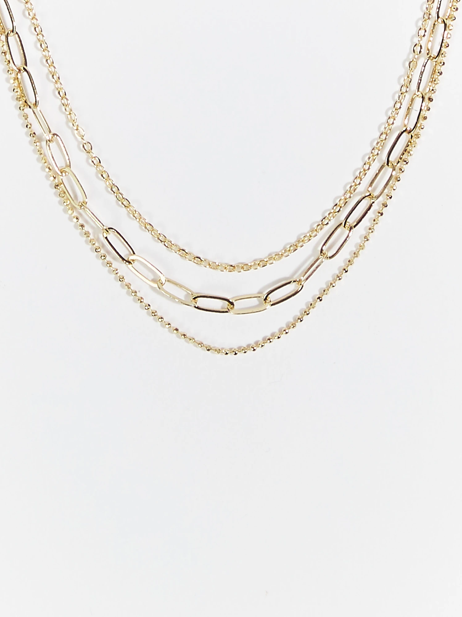 This triple layered chain necklace features 18k gold dipped hardware that has an anti-tarnish finish. A dainty, textured accessory that easily completes your everyday look with bohemian chic style and a pop of effortless shine!