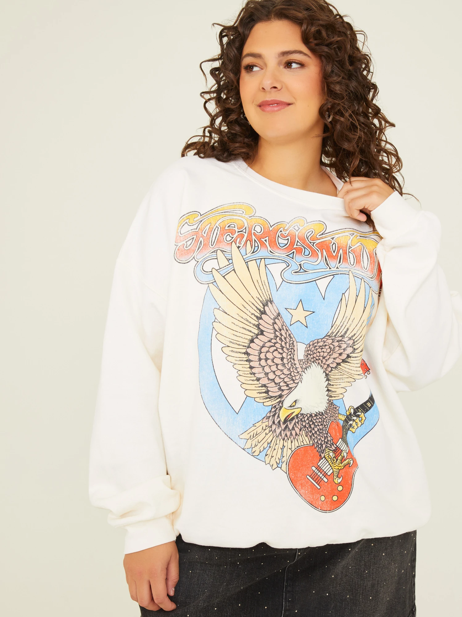 Rock on with this oversized Aerosmith sweatshirt, featuring a vibrant, distressed graphic of an eagle and a guitar. The vintage-inspired design captures the spirit of the iconic rock band, making it a must-have to stay cute and cozy.