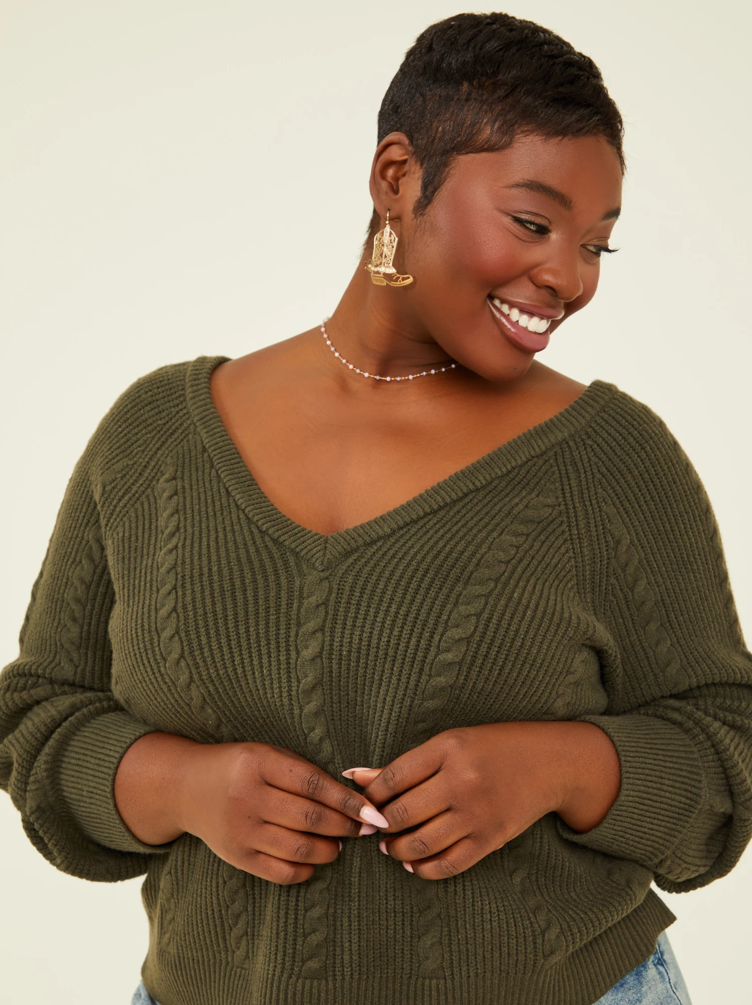 The epitome of cozy chic that wraps you in warmth and style, this classic cableknit sweater will be your new favorite go-to for the upcoming season. The v-neck design is both flattering and versatile, allowing you to pair it with your favorite accessories or wear it on its own. It’s perfect for both casual outings and more formal affairs.