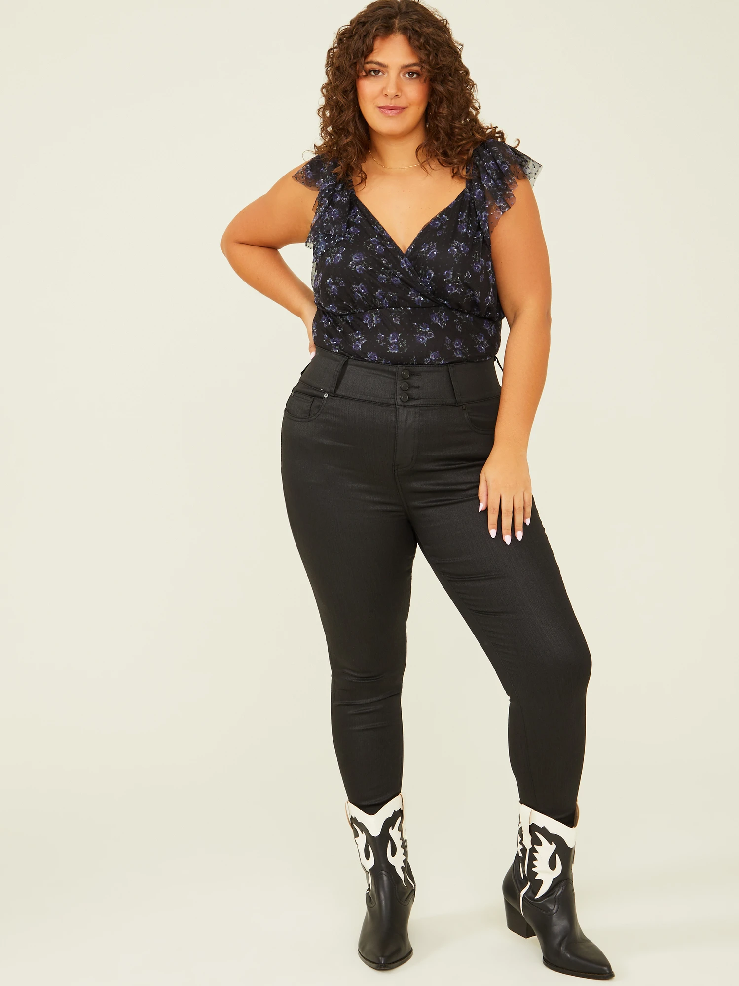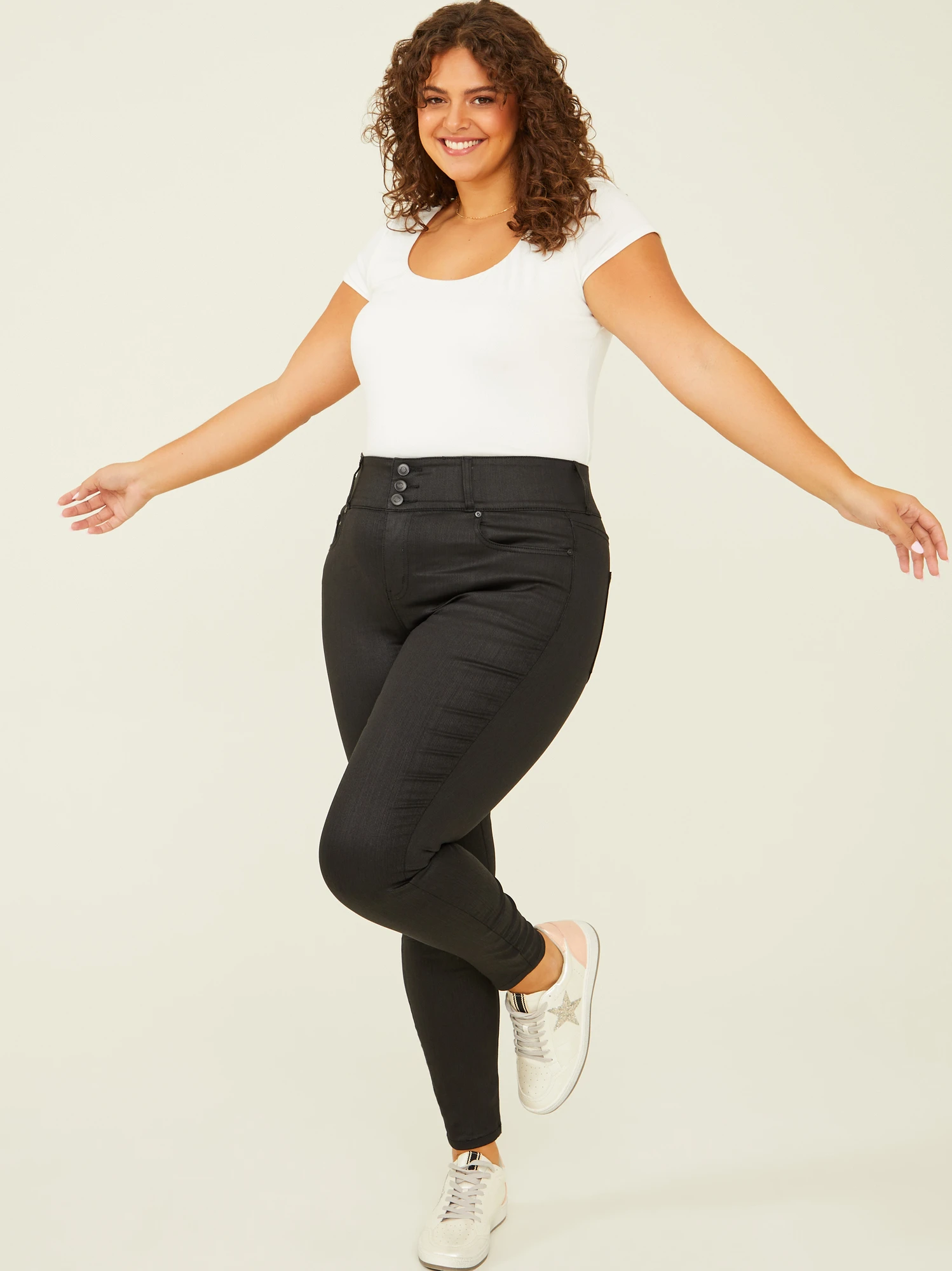 Your favorite skinnies are back with a unique coated leather touch! This triple button high-rise jean features a wide 3″ elastic band for added contouring and support. No matter the occasion or the trend, comfort is key with the best shaping stretch fit. The versatile black hue is perfect for dressing up any look or simply keeping it casual.