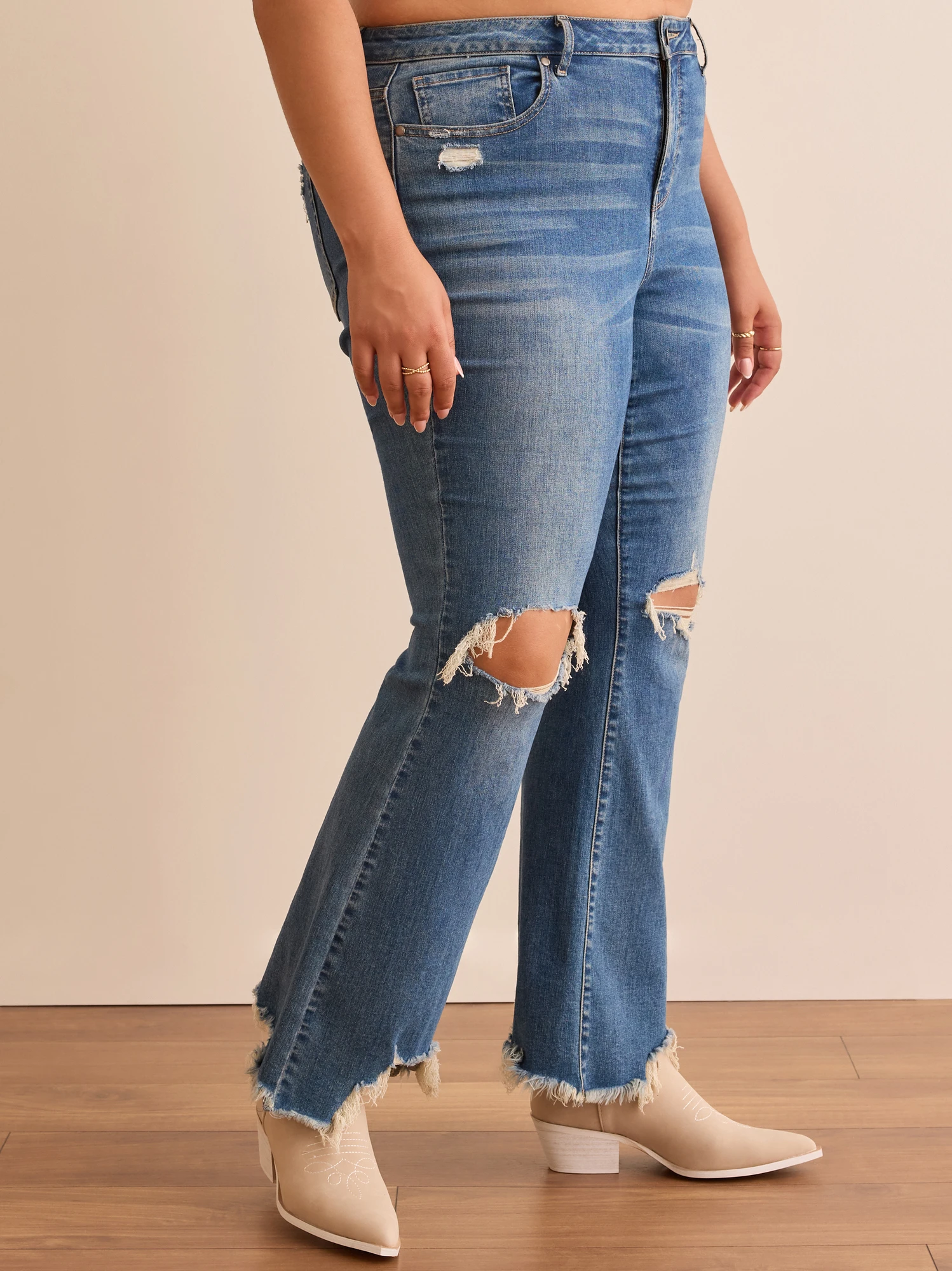 Our Incrediflex waistband features customizable inner support that conforms to your body for a fit that is truly tailored to your unique shape! These stretchy high-rise jeans are the perfect flattering fit and a wardrobe must have for any gal and any occasion. The special destructed detailing on the knees and fun raw edge hem are perfectly met with a classic boot cut.