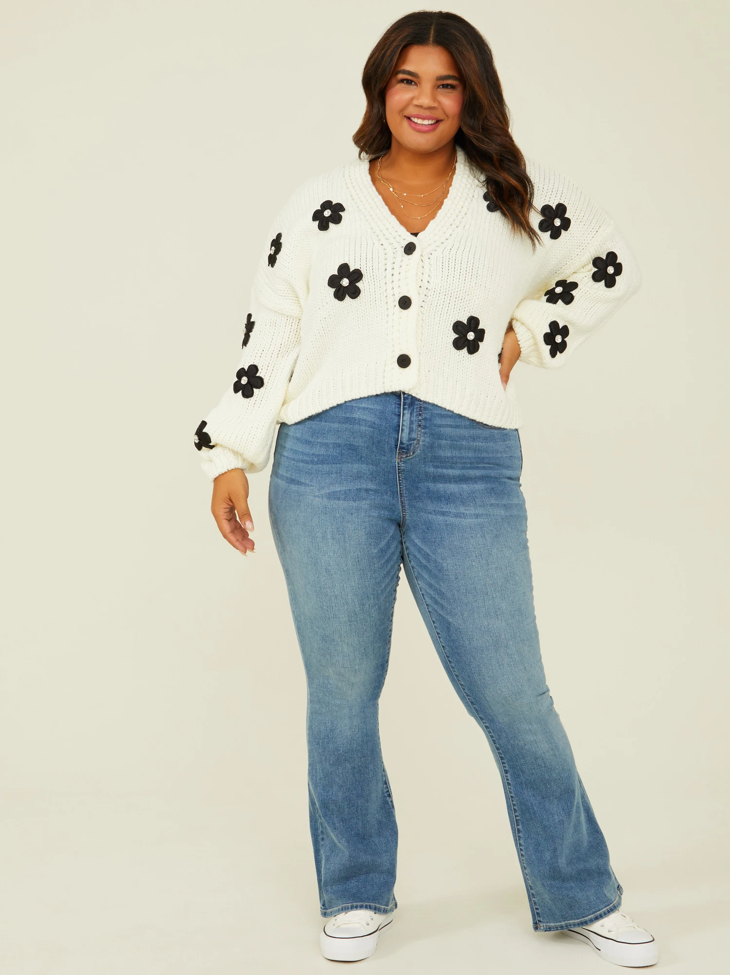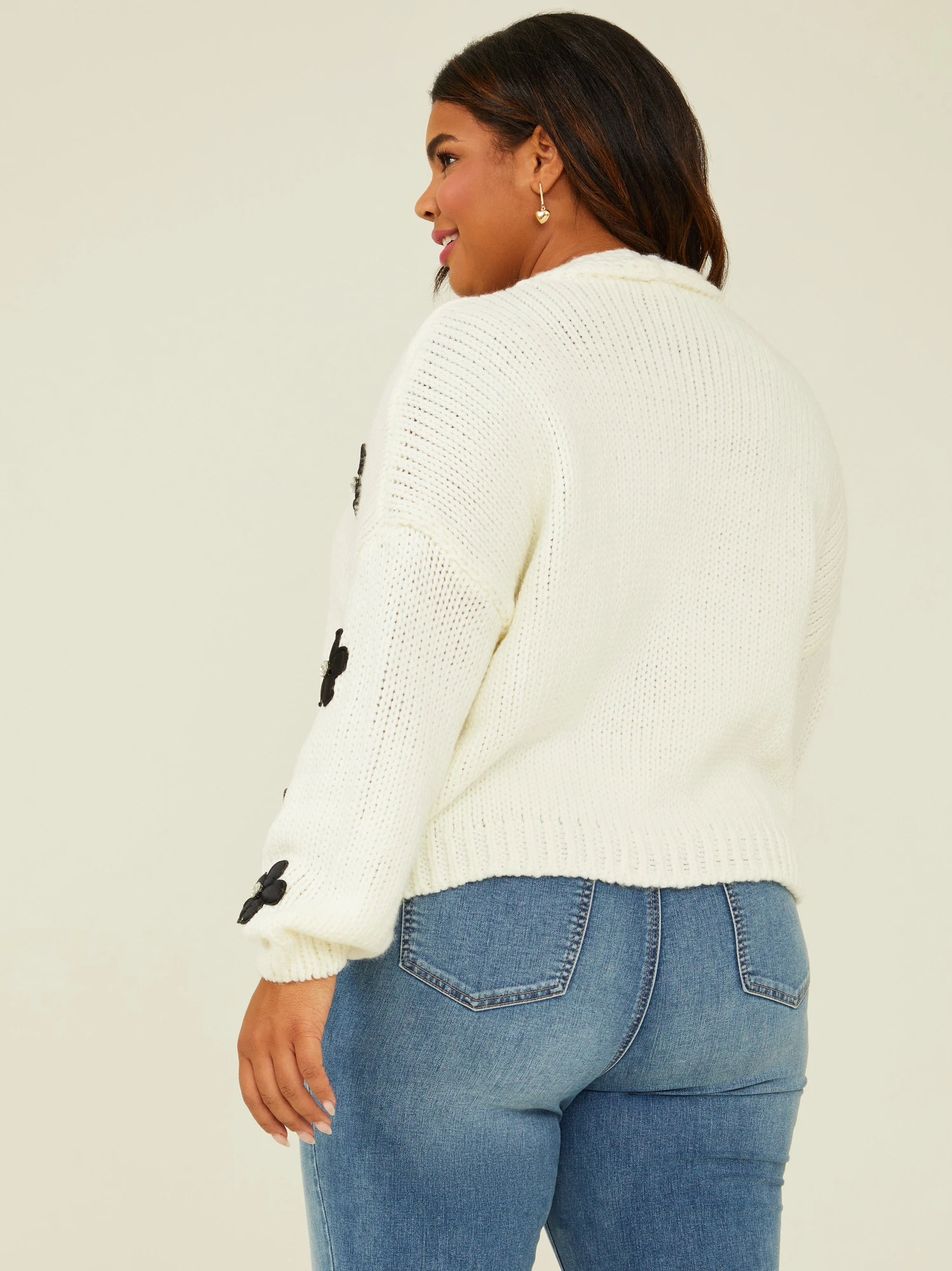 Embrace the soft allure of texture and stunning sparkle of crystal embellishments, and let your fashion sense bloom with this exquisite cardigan. Where sophistication meets effortless shine in a harmonious blend of fashion and elegance. With its versatile design, this cardigan is perfect for dressing up or down to match your unique style.