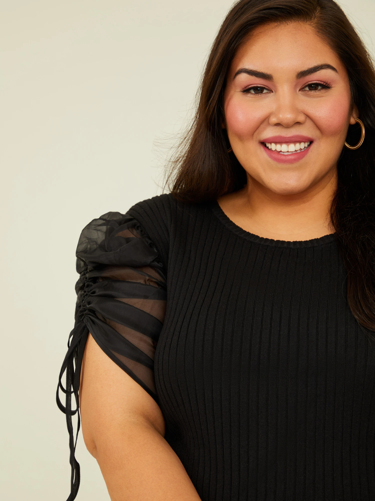 Designed to make you stand out, this stunning mixed contrast top features a curve-hugging knit bodice. The tulle puff sleeves create a dramatic and whimsical effect, adding a touch of romance to your look. The cinch ties provide a flattering silhouette, allowing you to adjust and customize the fit to your liking.
