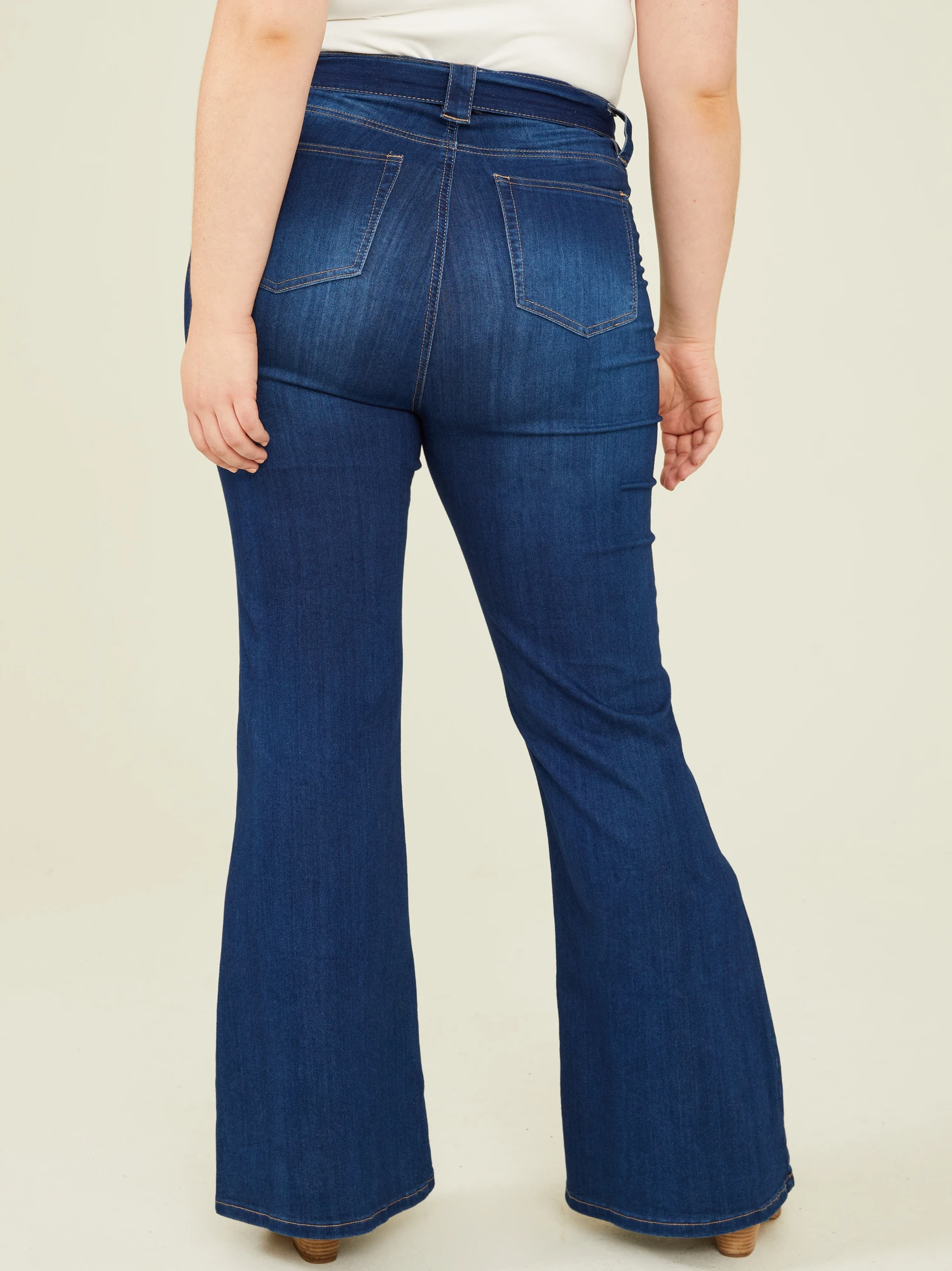 These stretchy high-rise jeans have flattering front exterior pockets and a special belted waist! The tried and true medium wash is oh-so timeless with the classic exposed stitching, and the flare hem is perfect for wedges or heeled booties.