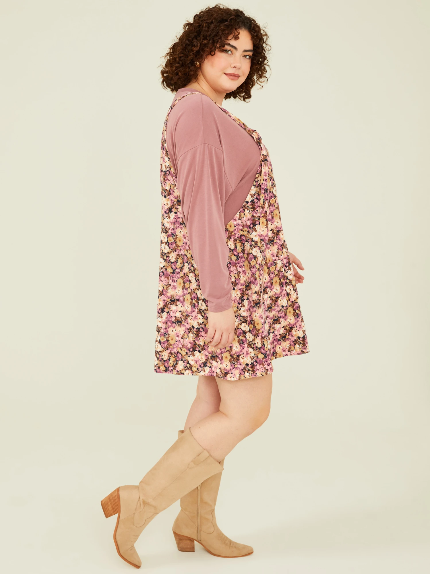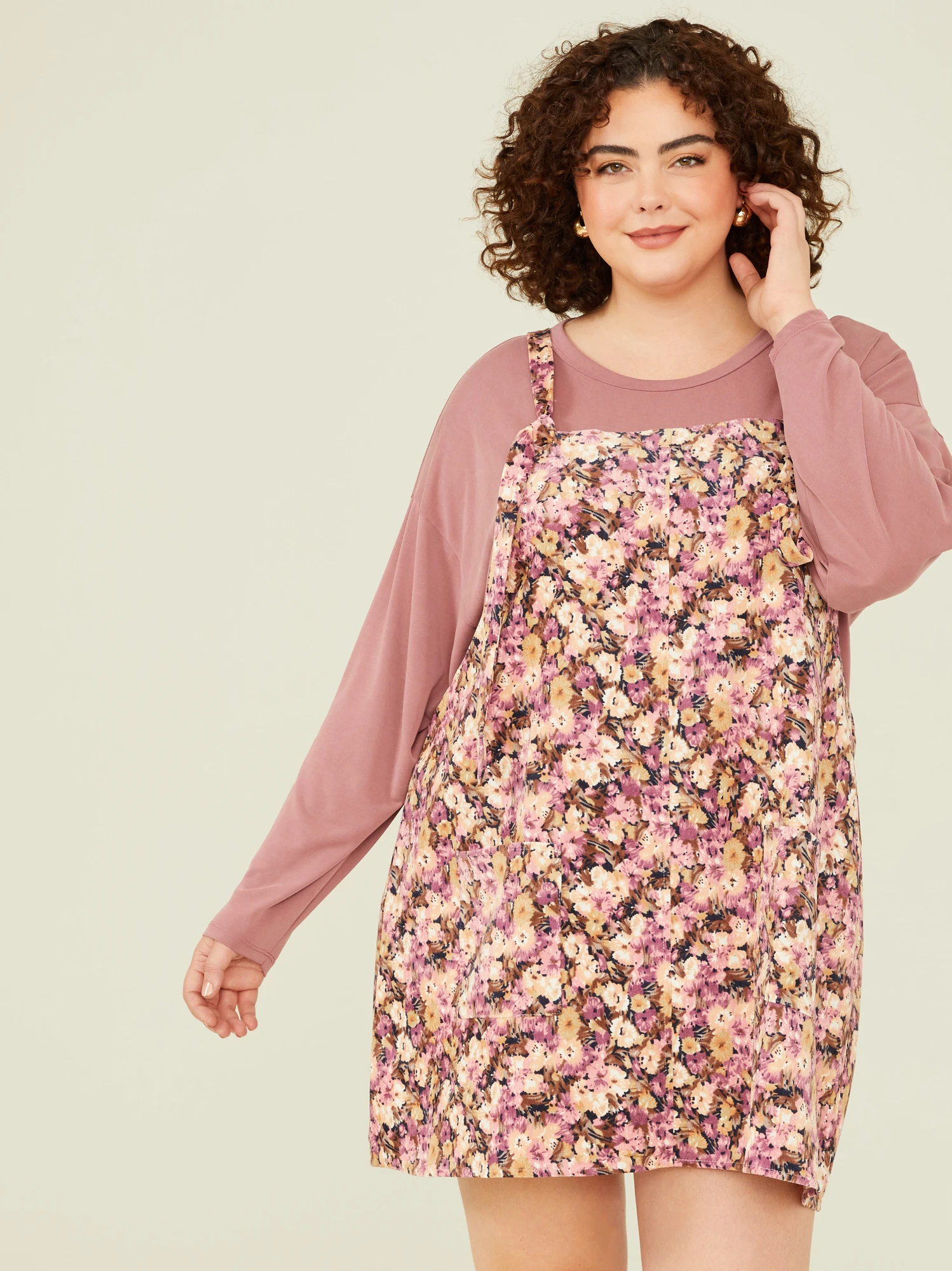 Featuring adjustable straps and a relaxed, curve-hugging silhouette, this floral skirtall is perfect for transitioning through the seasons. The corduroy texture adds a soft touch, and the two front pockets offer both style and convenience.