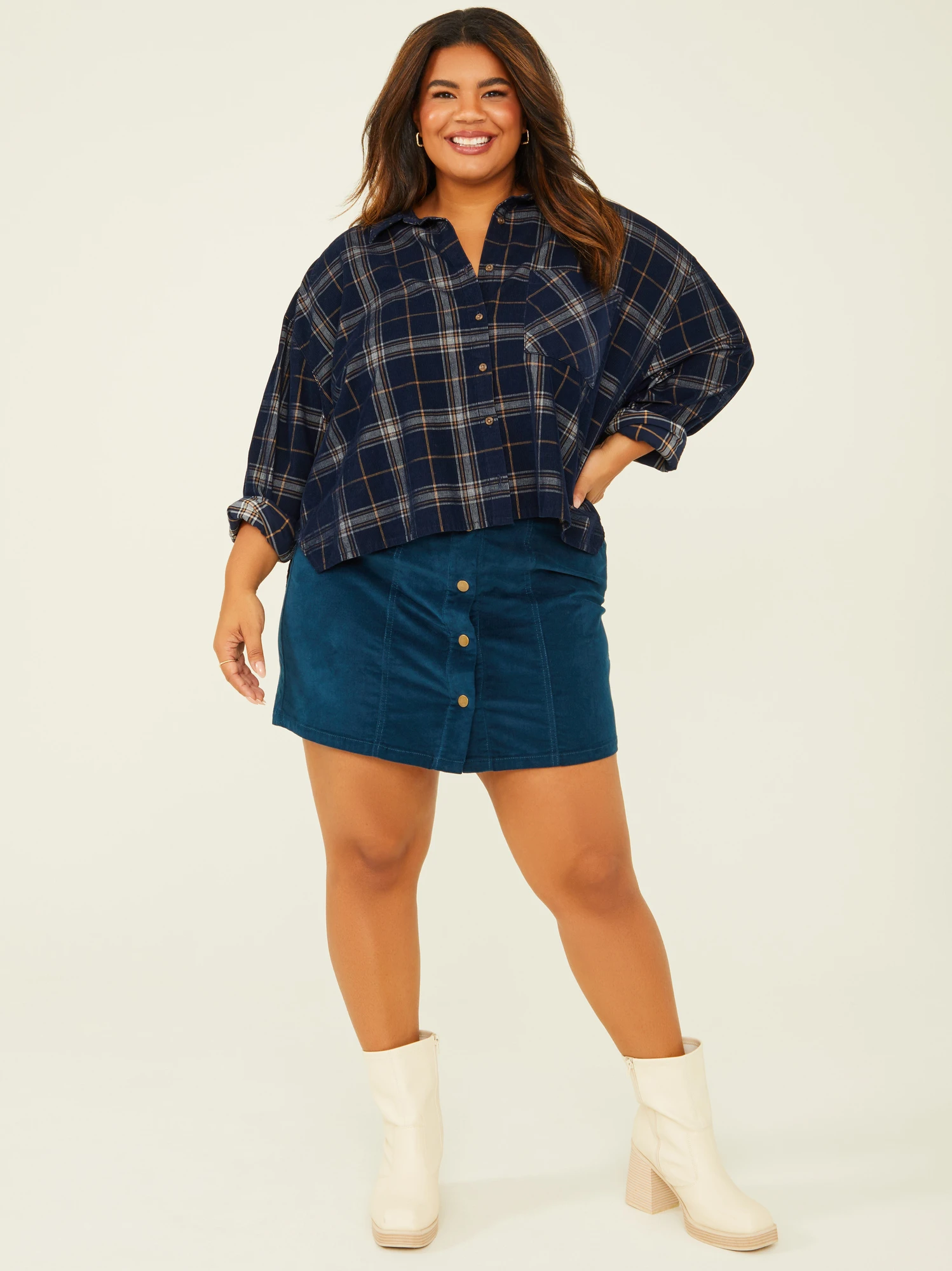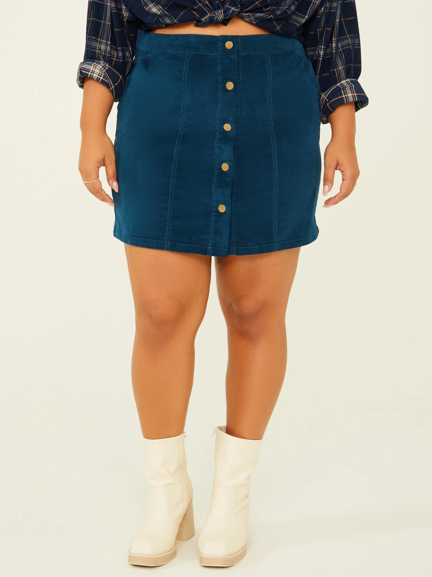 Whether you’re dressing up for a casual outing or adding some flair to your everyday style, this skirt effortlessly enhances your look. The structured, corduroy fit adds a vintage touch, while the two front pockets and buttons provide functional ease.