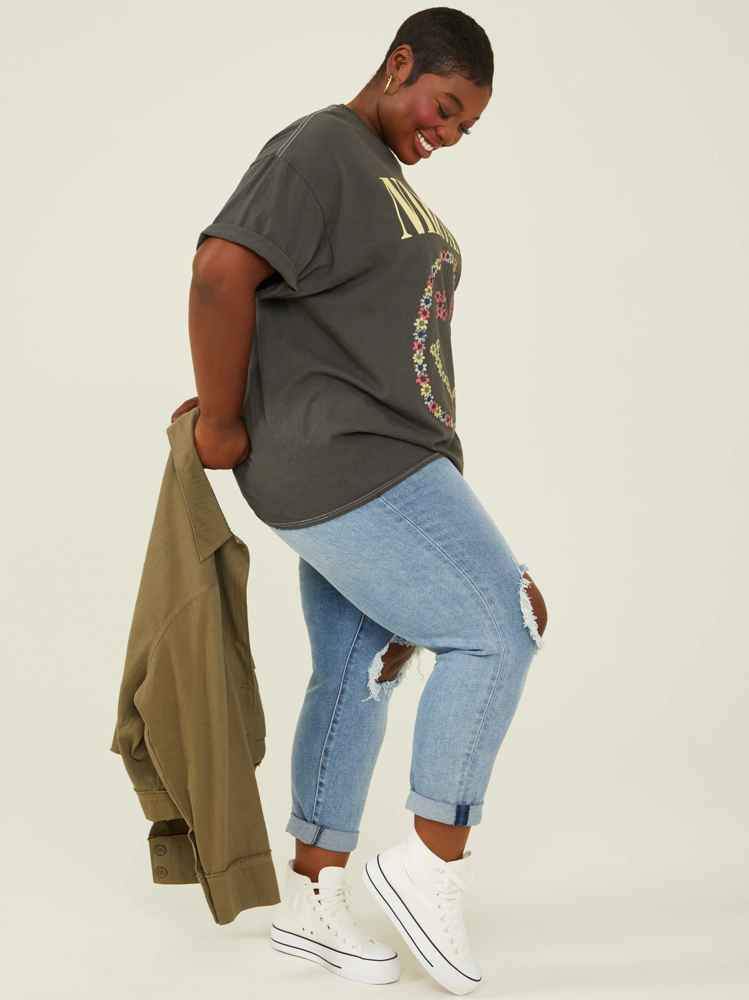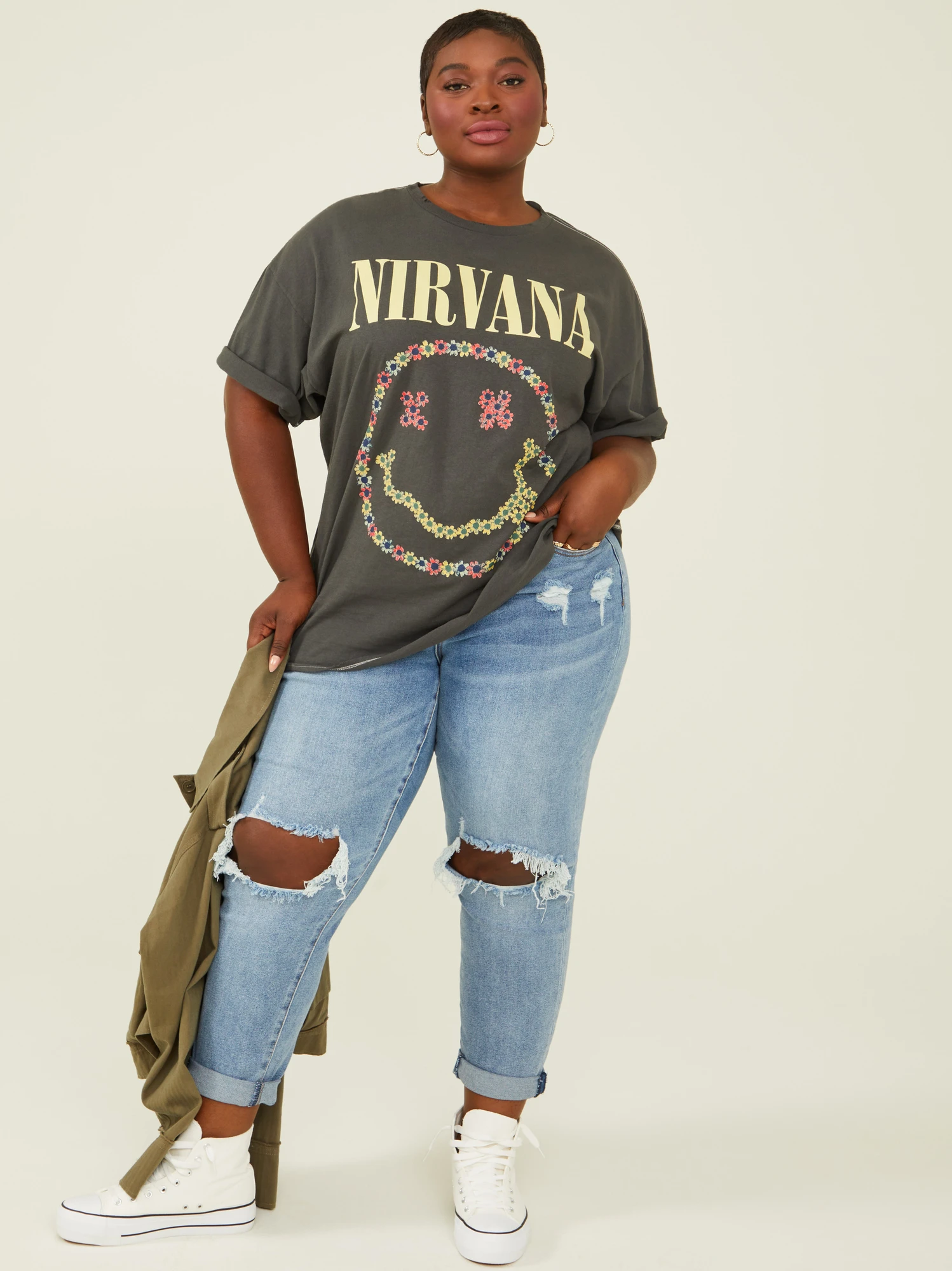 This tee is a must-have for any rock and roll fan! With a soft cotton touch, this tee features an oversized fit that is both comfortable and flattering. The floral smiley face graphic adds a touch of femininity to the classic Nirvana logo, making it perfect for pairing with your favorite jeans or biker shorts.