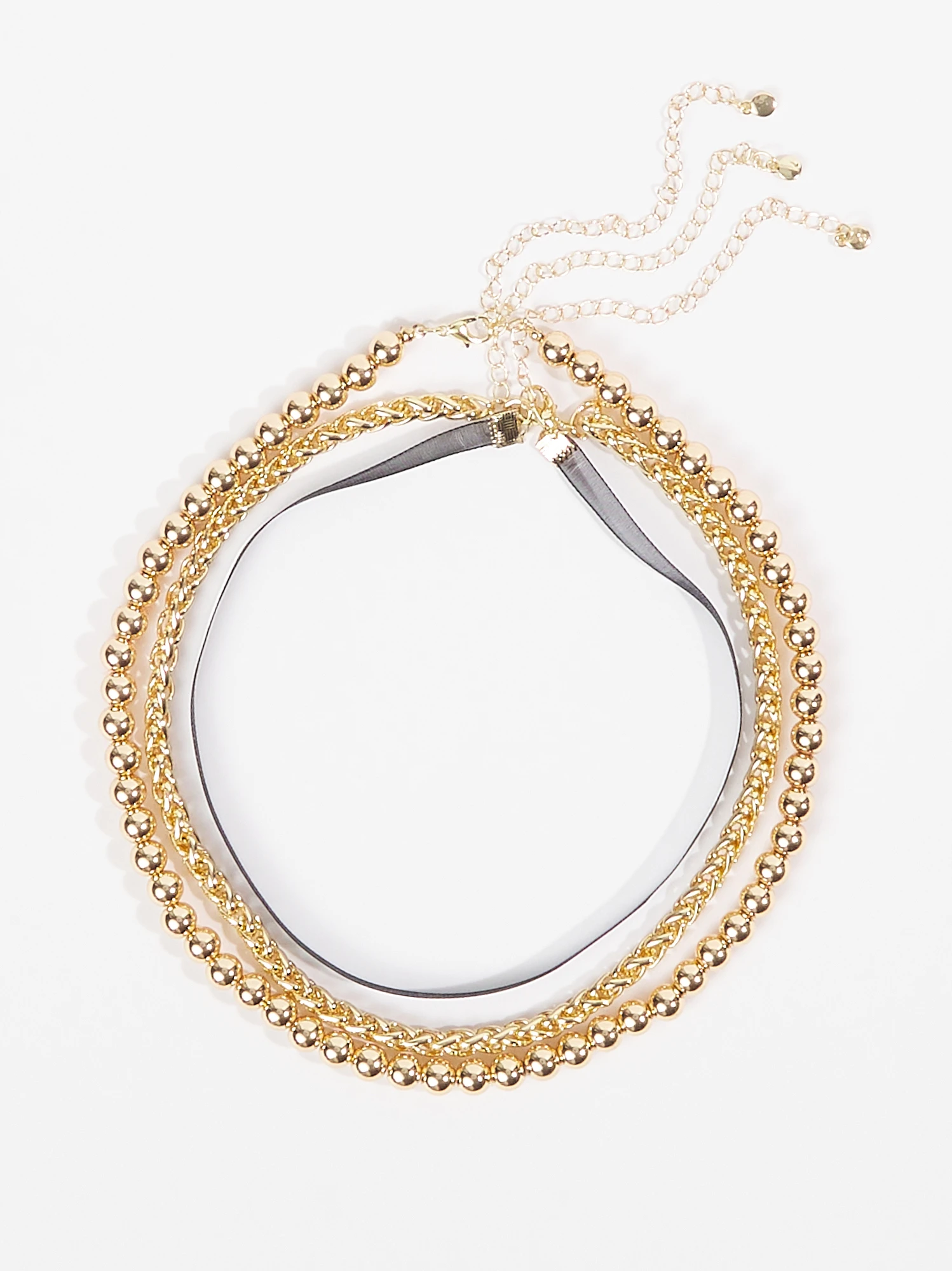 This set includes chic gold beaded necklaces and a delicate chiffon choker, offering you versatile options to enhance your style. Embrace the beauty of mixed textures and make a statement with this captivating accessory trio.