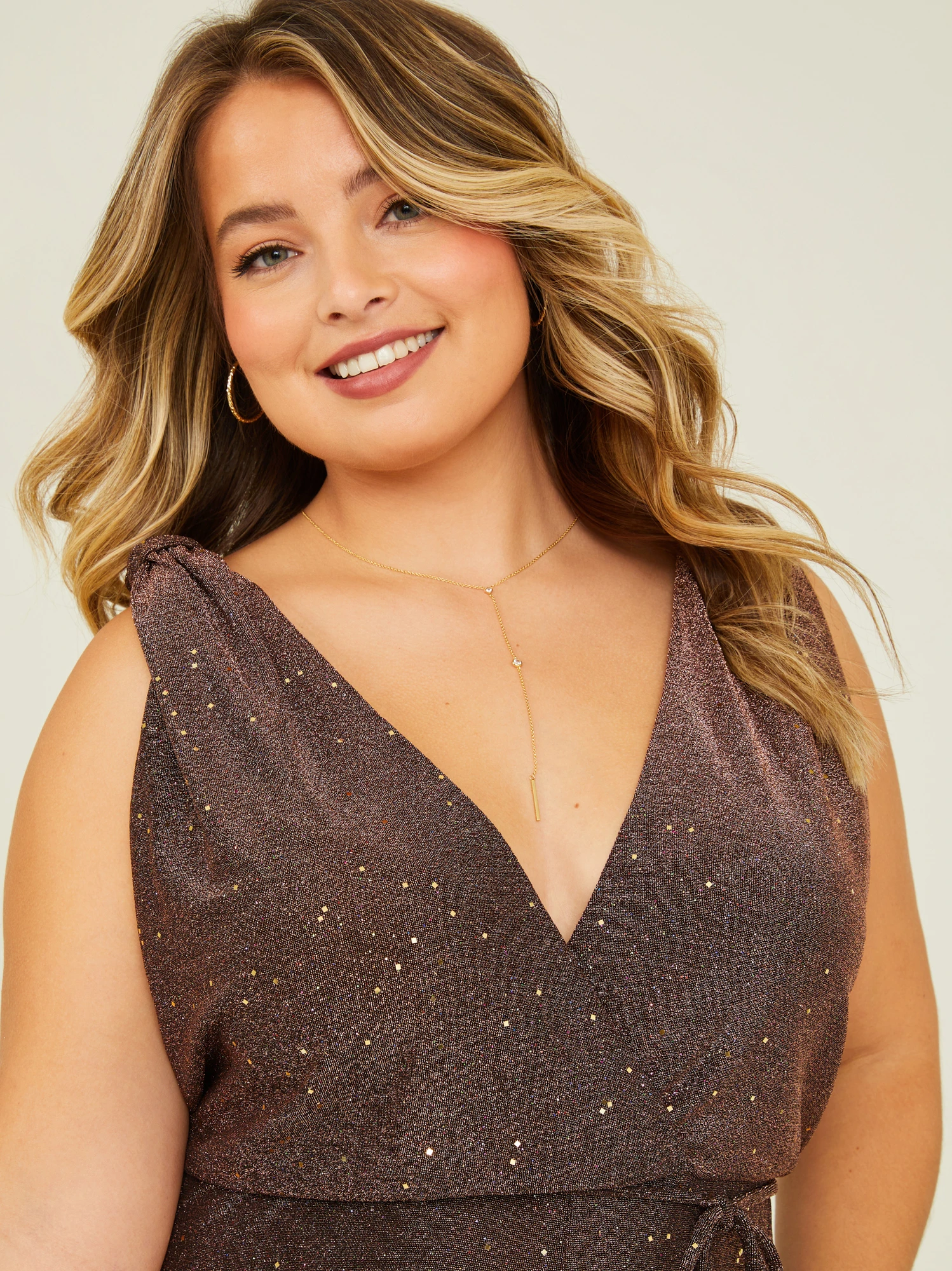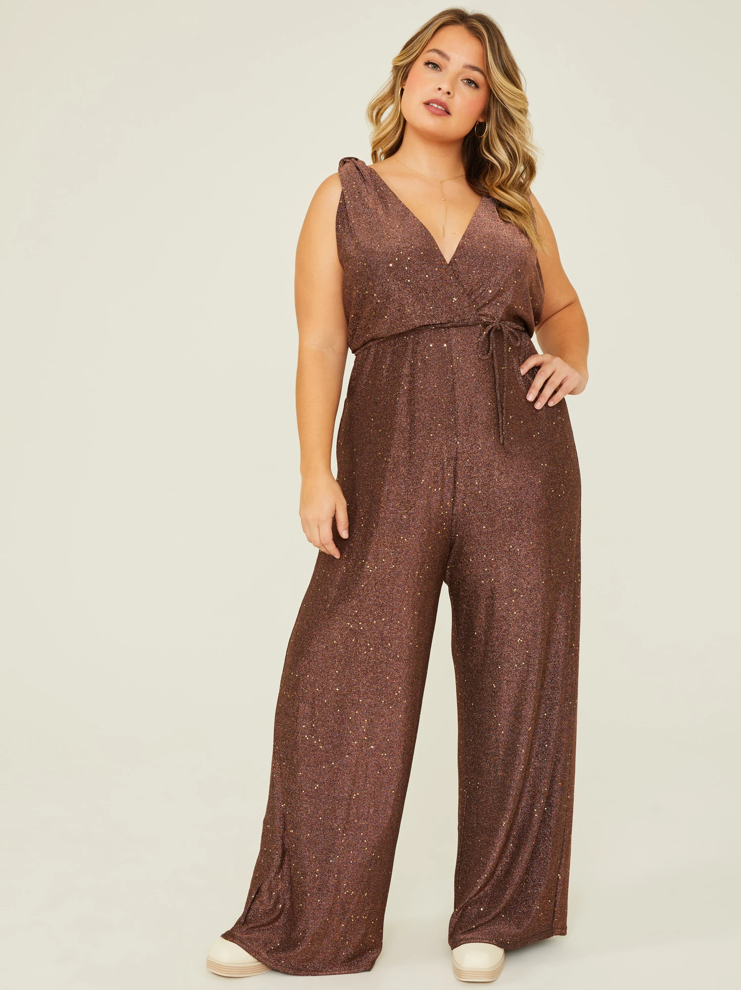 Shine bright at your next special occasion with this shimmering jumpsuit! Its unique glitter touch creates an eye-catching effect that’s perfect for making a statement. The knotted shoulders and adjustable tie around the waist add a touch of elegance, while the v-neck and stretch fit offer a flattering silhouette.