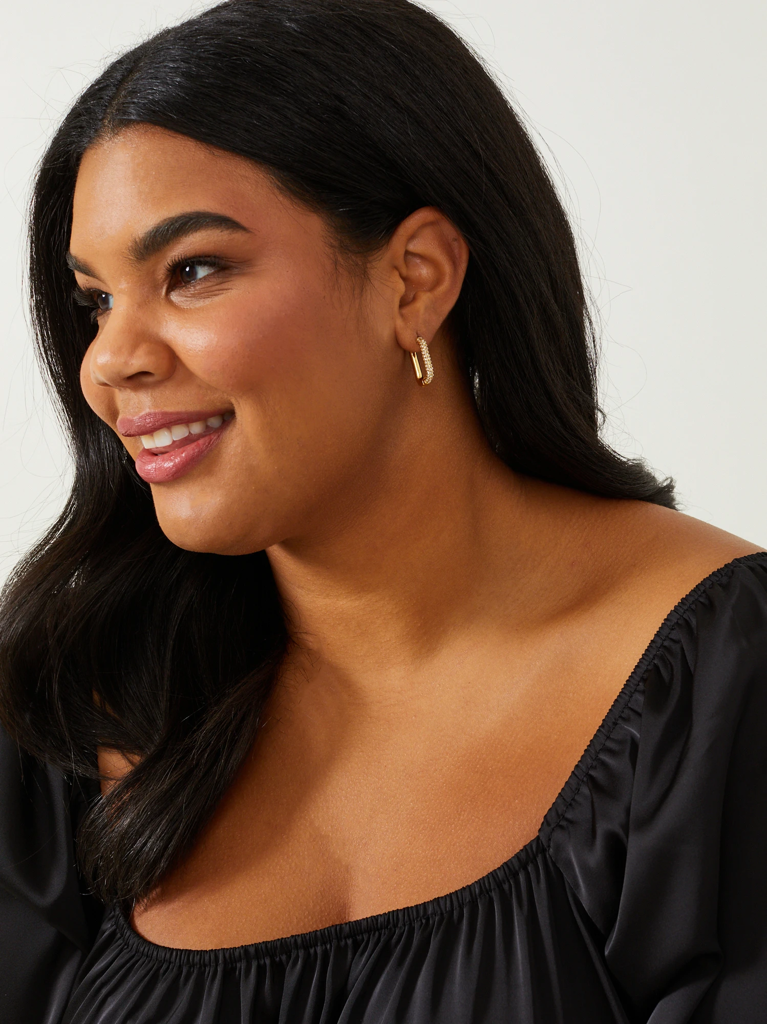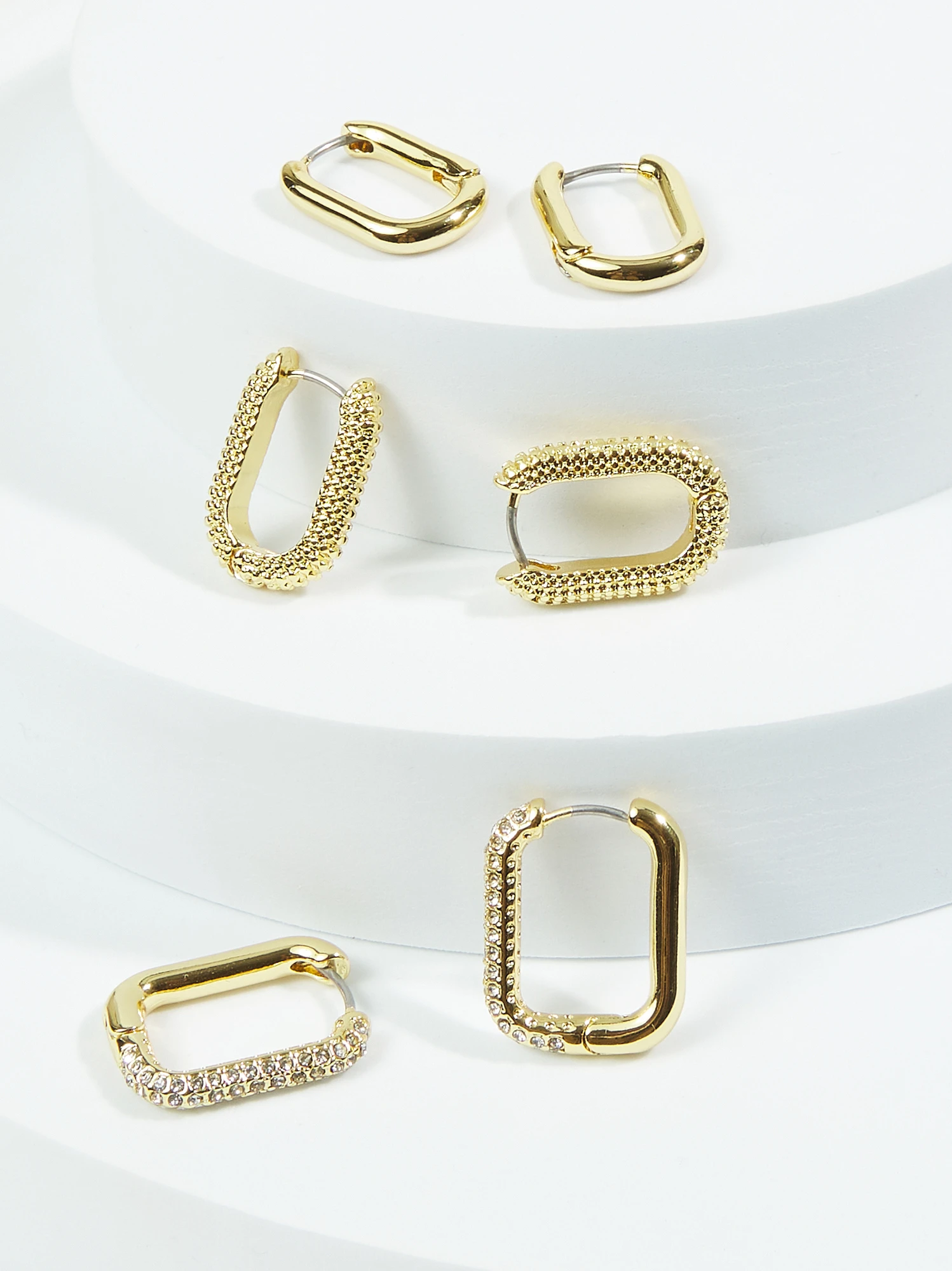 Switch out your standard hoops for this unique rectangular shaped set! This three-pack earring set will have you covered from shiny and glitz to textured and smooth. An adorable way to mix, match, and stack your earrings.