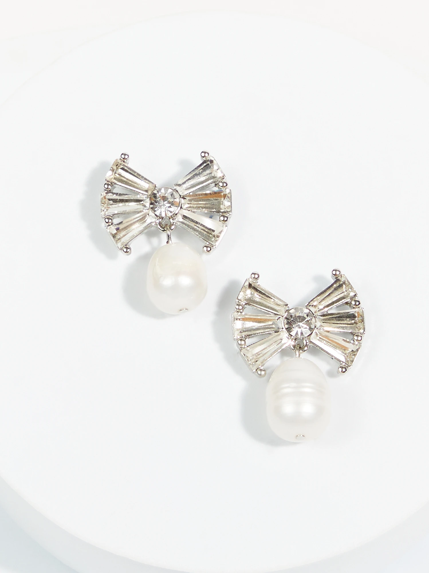 Each earring features a delicate and sparkling bow design with a pearl bead drop, creating a graceful and timeless look. These lightweight earrings are the perfect choice to elevate with charm.