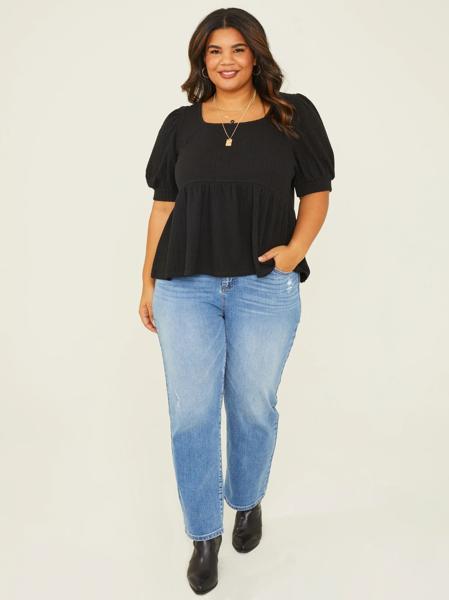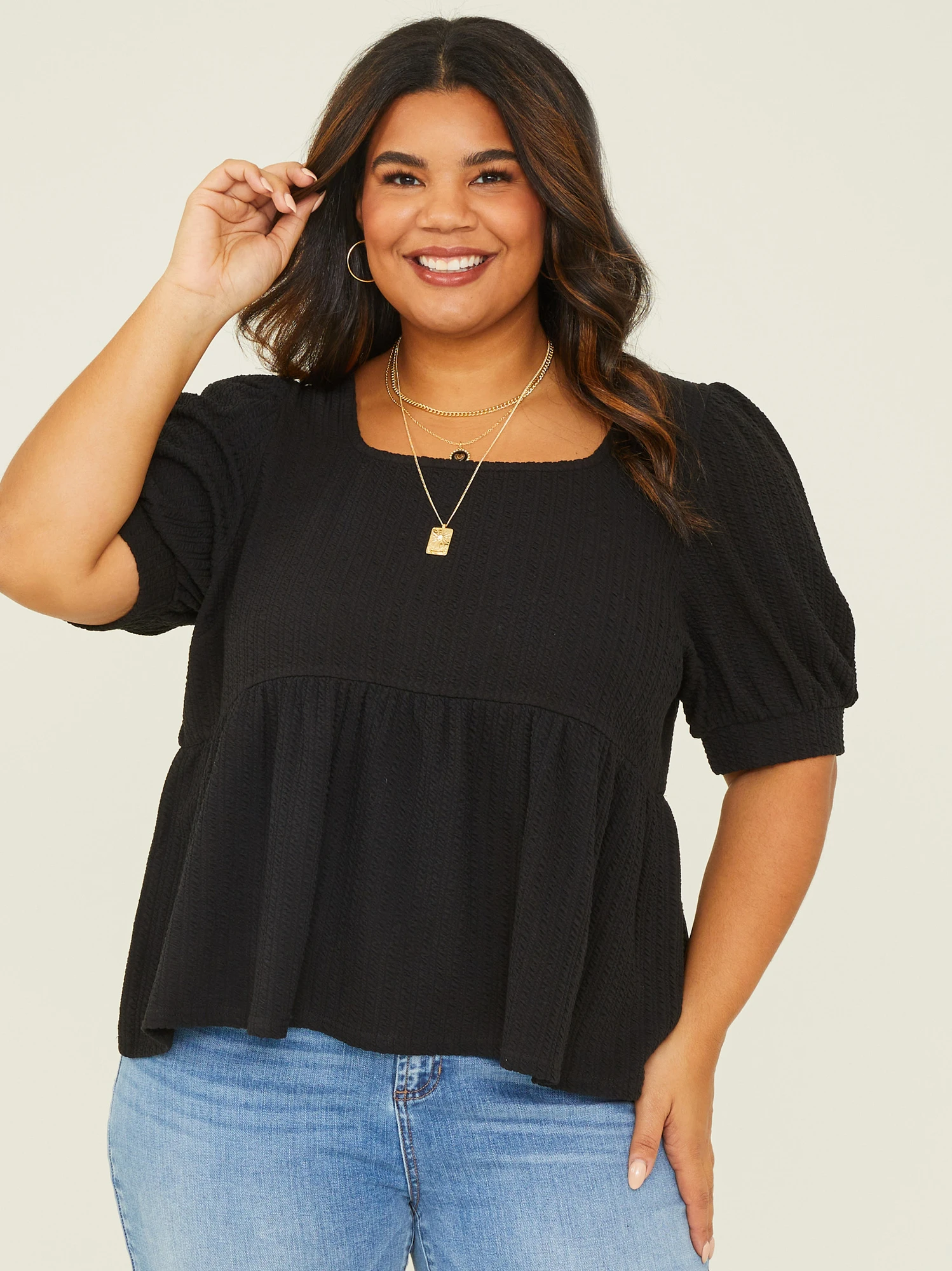 This versatile babydoll top features a soft knit texture that’s perfect for all seasons. The puff sleeves add a touch of whimsy and femininity, making it suitable for both casual outings and relaxed gatherings. The subtle elastic details ensure a comfortable and flattering fit.