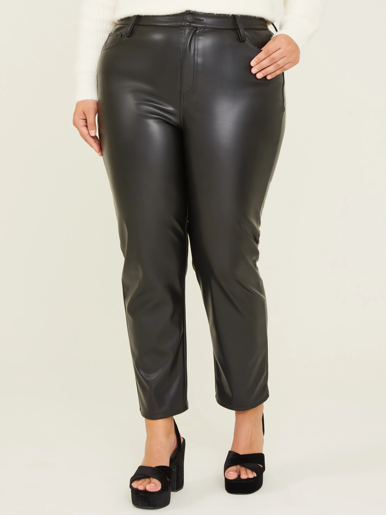 With a slim straight fit and cropped ankle length, these timeless vegan leather pants offer a sleek silhouette that’s perfect for a variety of occasions. Crafted with meticulous attention to detail, these pants feature a soft touch and stretchy fit that feels great against your skin.